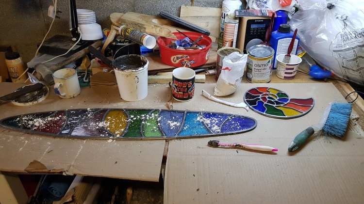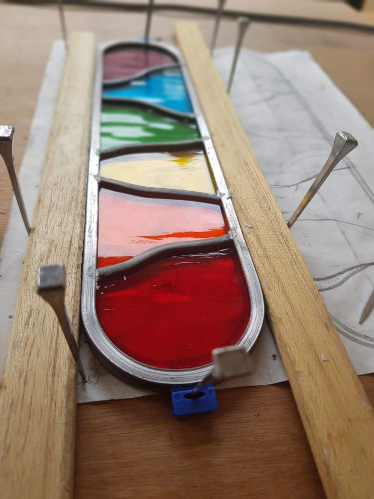 The outdoors glass work needs some extra protection from the elements. I use lead cement to seal the glass to the lead so water can’t freeze and crack the glass.